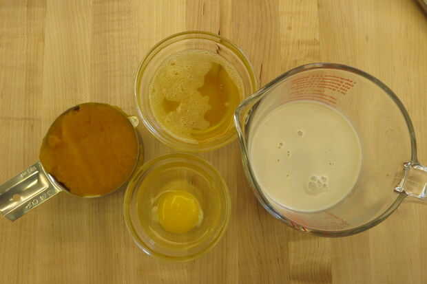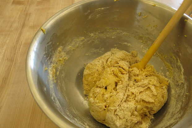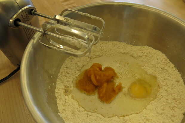 Ahora que la mantequilla se haya enfriado un poco, puede agregar aproximadamente ⅔ de él a los ingredientes secos. Usas el resto de la mantequilla durante el montaje de rodillo. Usando una batidora eléctrica o batidora, mezclar bien la mantequilla en los ingredientes secos. Luego, añadir la calabaza, el huevo y la mezcla de leche/levadura. Revolver hasta que se combinan todos los ingredientes y la masa se ha retirado de los lados del tazón de fuente. Si tienes una buena batidora eléctrica usted puede seguir usándolo. La masa tendrá un poco tiesa por lo que podría ser mejor seguir mezclando con la mano en este momento.