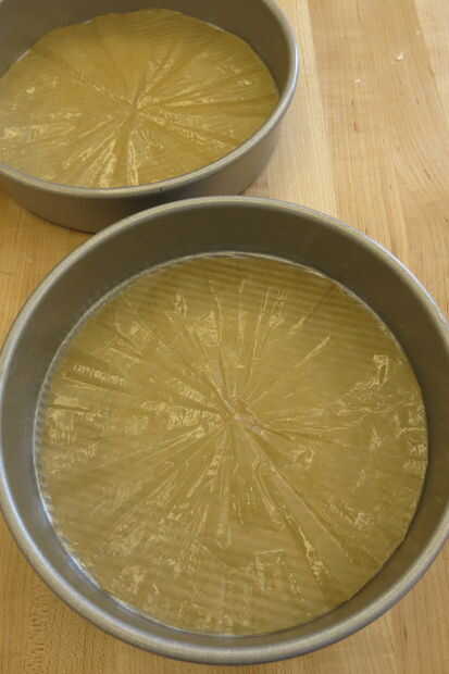 Mientras la masa crece, preparar sus utensilios para hornear. Usé dos bandejas para hornear redondeos de 9 pulgadas. Cortar un círculo de papel pergamino para forrar las bandejas. Entonces, usando un cepillo cubierto el fondo y los lados de los moldes con un poco de mantequilla. Aceite o antiadherente en aerosol funcionaría bien.
