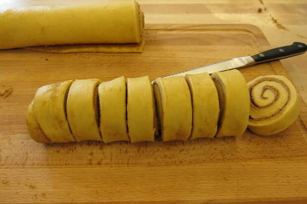 Ahora tienes un canela rodillo de registro. Cortar el tronco por la mitad (aproximado es fino). Cortar cada mitad en 8 rodajas. Lo hago cortando en mitades, luego para cuartos y octavos. De esa manera son uniformes en tamaño.