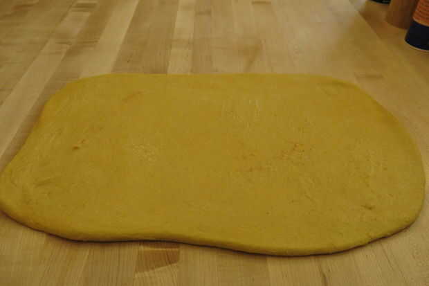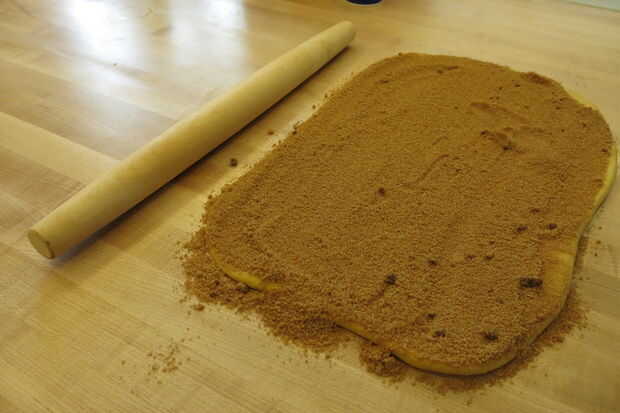 Extienda el resto de la mantequilla derretida sobre la masa enrollada hacia fuera con una espátula de goma o cepillo. Espolvorear la mezcla del relleno sobre toda la superficie del rectángulo, alisando hacia fuera con las manos. Comenzando con el lado largo del rectángulo, rodillo del rectángulo en una espiral, tratando de mantener lo mas ajustado posible. Esto puede ser difícil, pero a partir de la espiral apretada hará que el resto del balanceo más fácil.