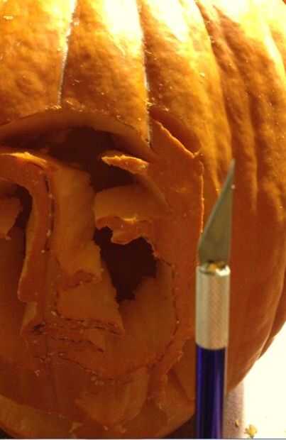 Hay probablemente unos bits de fibrosas en la parte trasera que a hacer la calabaza parecer divertido, así que adelante y darle un rasguño rápido otra vez. También, si tienes un cuchillo X-acto, utilizarlo para apretar cualquiera de los cortes que se ven un poco irregulares (a menos que sea el look que vas para).