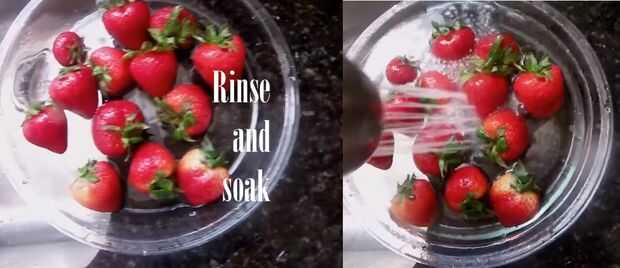Recoger las fresas más frescas, más bonitas del racimo y darles un enjuague con agua y remojar durante al menos 10 minutos. El remojo ayuda a eliminar cualquier pesticidas de las bayas.