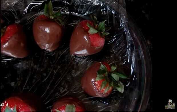 Usando un palillo o tenedor, la fresa por la parte superior del palillo y en el chocolate. Permitir que cualquier exceso chocolate gotee en el recipiente. Coloque cuidadosamente las bayas en la placa.
