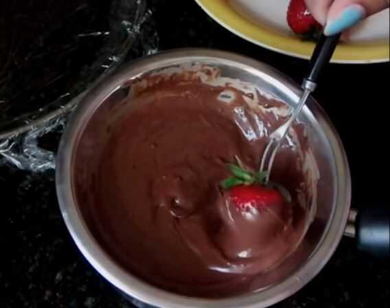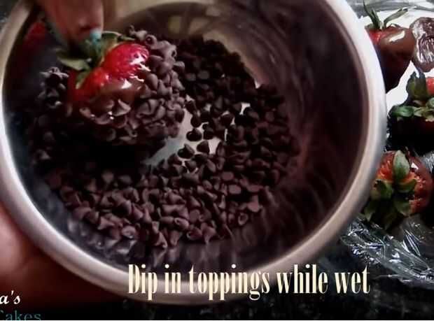 Después de sumergir las frutas en chocolate, inmediatamente echar chispas de chocolate mini y hasta la cobertura completa del rodillo. Poner en una hoja para hornear forrada pergamino. Refrigere las bayas durante 30 minutos o hasta que el chocolate ha puesto completamente.