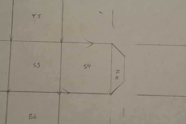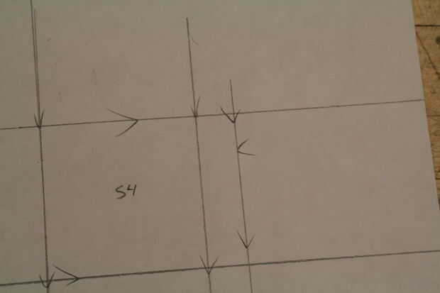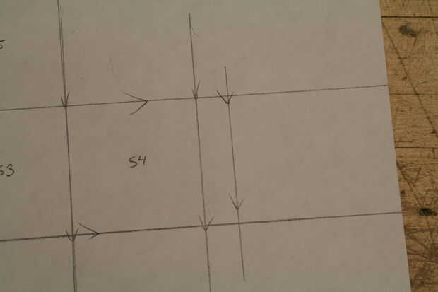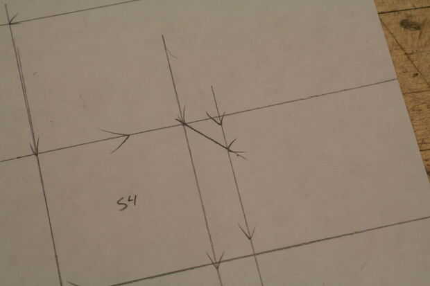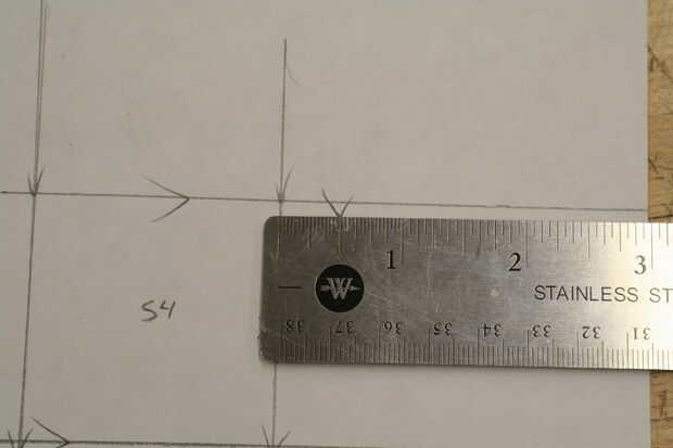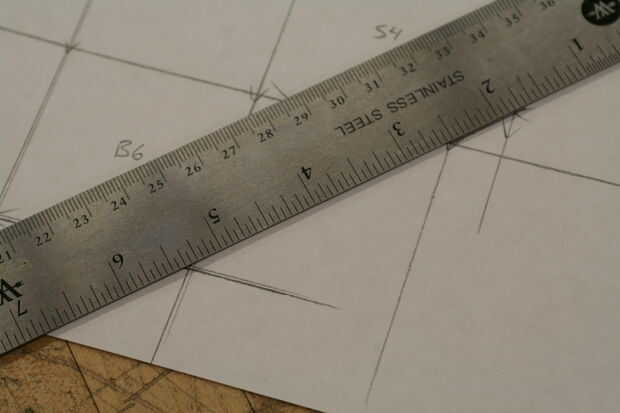 Última cosa que hacer en este paso! Poner los ángulos en cada ficha como hicimos con el primero. Tenemos otro pequeño truco aquí para acelerar las cosas sin embargo. Elegir una esquina, tu primera flecha 1/2 una pulgada en la marca como hicimos la última vez. Ver imagen 10. Alinear su regla, igual que antes, y dibujar una línea de la flecha en la esquina de la Plaza, pero esta vez continuar la línea a través de la siguiente ficha como se muestra en el cuadro 11. Dos pájaros de un tiro! Una flecha para marcar dos lengüetas. Repita para el otro lado de la pestaña. La parte inferior de las pestañas en los lados tiene que hacerse a la antigua moda manera-Mida 1/2 una pulgada, marca una flecha, rayar una línea. Todo hecho! Ver lo que debe imagen 12. Repita para la Plaza de abajo.