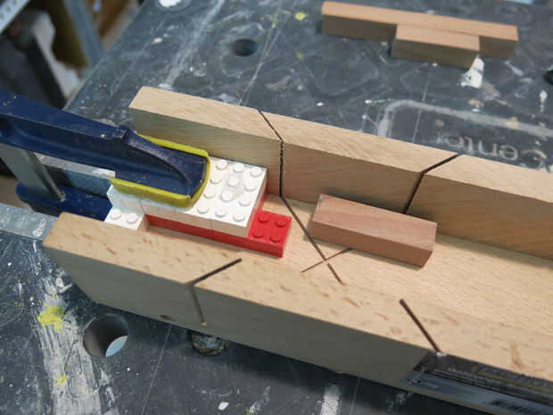 Opcionalmente, puede hacer una plantilla improvisada con algunos Lego y una pinza, con el fin de ayudar a la colocación de la pieza de madera.
