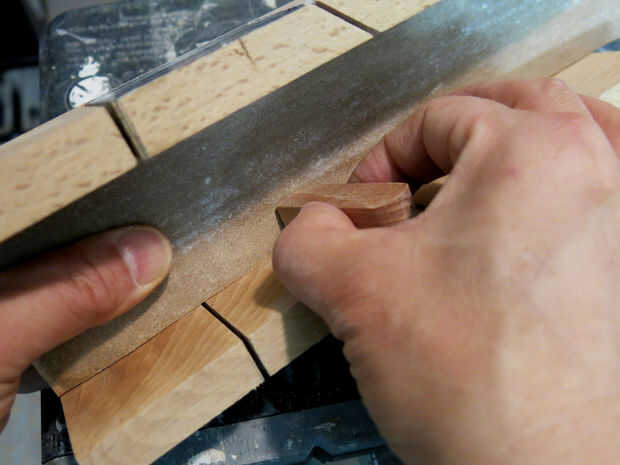 Con una mano, sujete la caja de ingletes con la tira de papel de lija en la parte inferior.