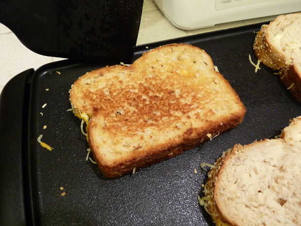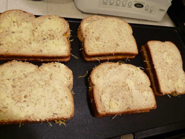 Coloque los sándwiches sin cocinar en la plancha caliente seco. Se les oye comienzan a chisporroteo, debido a la mantequilla. Yum! Cocine hasta que el lado de la plancha es agradable y tostado y el queso dentro está comenzando a derretirse.
