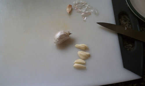 Deben ser frijoles en la olla. Agregar agua hasta 1" de la parte superior. No agregar sal en este momento. Hará su grano duro. Romper sus dientes de ajo con la parte plana de un cuchillo. La manera fácil de hacerlo es descansar el cuchillo en la parte superior del diente (que debe estar en una tabla de cortar), luego golpear el cuchillo con el talón de la otra mano sosteniendo el cuchillo. No gire la cuchilla abajo! Pelar el ajo y ponerlo en la olla - sin necesidad de picar o trocearlo. El ajo es opcional, pero me gusta el sabor sutil que da las habas. No dude en omitir si no eres un fan de los clavos de olor apestosos.