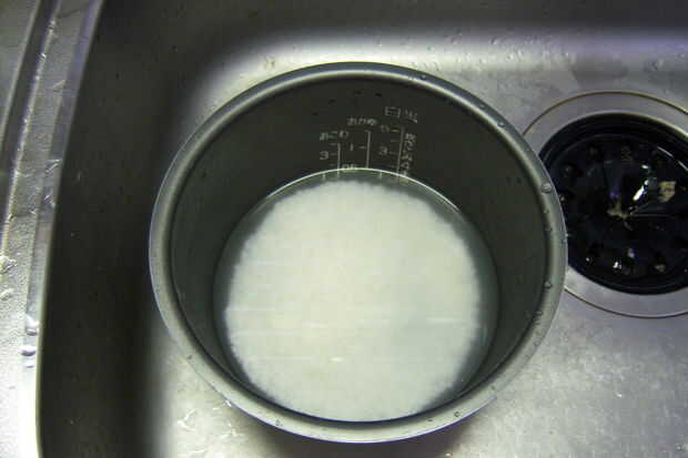 2) a continuación, vierta agua en el recipiente hasta que el arroz está bien cubierto, aproximadamente una pulgada debajo de la superficie. [Fig. 3] Los japoneses usan agua fría para esto, pero no estoy seguro si eso es crucial. (Tenía la congelación como un niño, por lo que generalmente utilizo agua tibia para guardar mis manos algo de dolor).