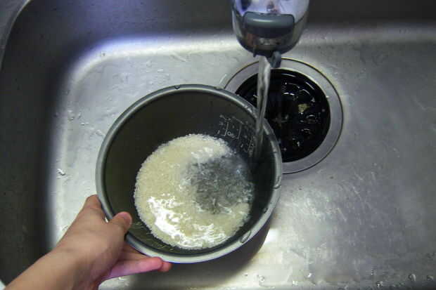 3) el agua será un blanco lechoso. Se trata de almidón (y algunas veces un aditivo de polvo de talco) de lavado de los granos. Con la mano, el siguiente paso es agarrar un puñado de arroz y trabajar por la fuerza a través de sus dedos, como intenta frotar todos los granos juntos. Esta acción frota más almidón de arroz y 'pule' los granos. [Fotos. 4 y 5 y el video abajo]