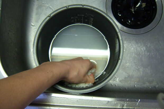 4) enjuague y repita. Después de tal vez 30 segundos de pulido vigoroso, cuidadosamente verter hacia fuera el agua lechosa y rellenar el recipiente con agua nueva. Repita el paso pulir otros 4 o 5 veces, cambiando el agua entre cada uno, hasta que por fin el agua bastante mucho claro. Luego volcar el agua demasiado. [Fig. 6 y el video abajo]