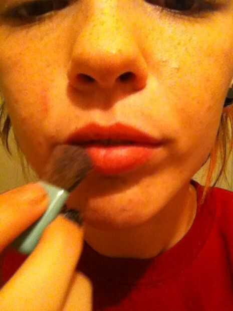 Paso 1: La reina Con rojo de mis paletas de maquillaje forever flash voy a colocar el corazón de Queens en el centro de mis labios.Paso 2: Cheshire Cat Utilizando lippie NYX en el color rosado que estoy colocando en tiras, luego tomando el color de r