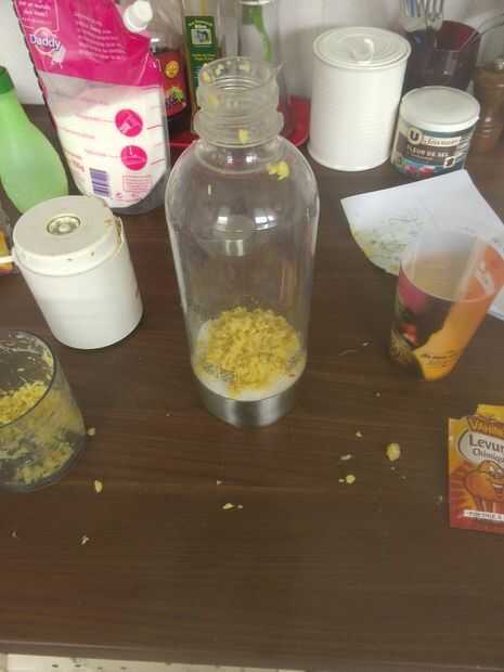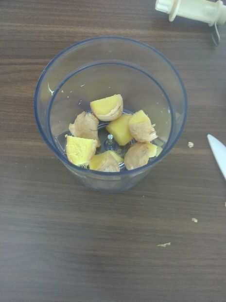 Tomar un trozo de jengibre y se mezcla. Necesita dos cucharada sopera de jengibre o más si te gusta pero que carfull. Poner en la botella.