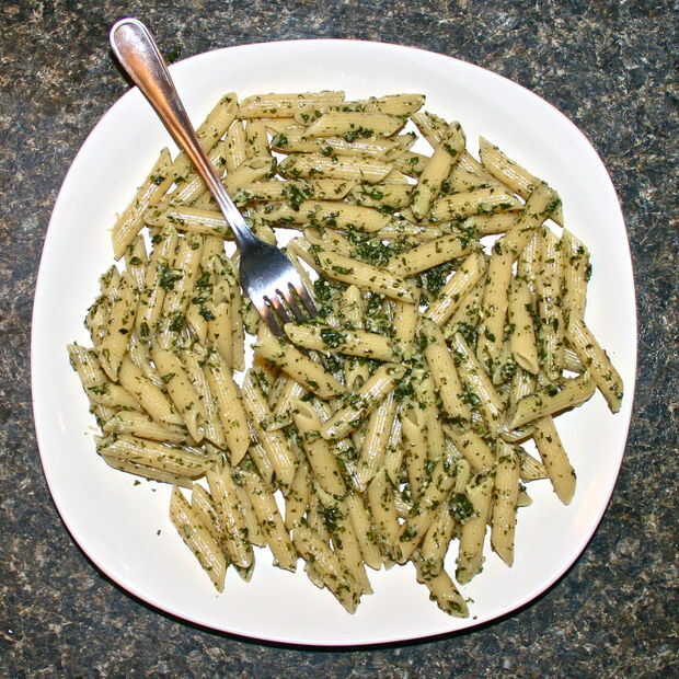 Pesto también es delicioso en fideos de arroz libre de gluten.