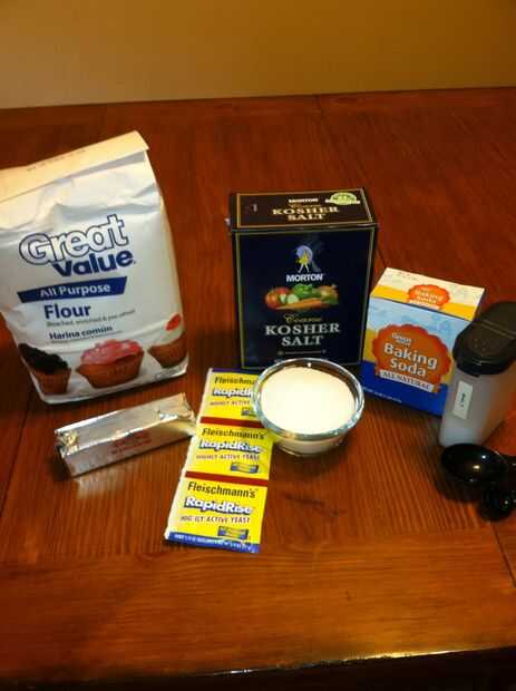 Necesitarás harina, azúcar, bicarbonato de sodio, sal (sal de mesa regular y sal gruesa), levadura seca activa y mantequilla (o margarina). Esta receta hace un montón de rosquillas, así que siéntete libre a mitad de la receta si no muchos. Sin embargo puede congelar los pretzels extras y los microondas más adelante. Son muy sabrosas y mucho más barato que el comprado.