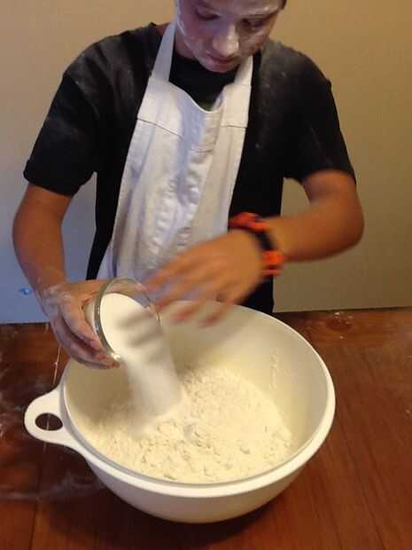 Seguir adelante y empezar a derretir 5 cucharadas de mantequilla o margarina, pero no añadir todavía. Poner 9 tazas de harina en un tazón grande. Por supuesto, una guerra de harina puede sobrevenir si tienes ayudantes, pero tratar de que al menos lo que necesita en el tazón de fuente primero. Añadir una taza de azúcar y 3 cucharadas de sal. Se mezclan bien.