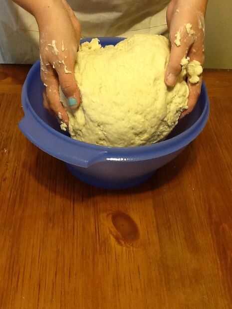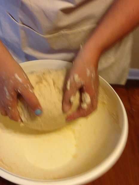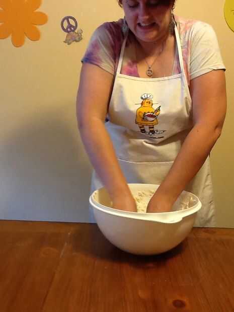 Now you put it all together. Hacer un poco bien en el centro de la mezcla de harina y vierta la mantequilla y la mezcla de levadura. Revuelva para arriba tanto como puedas hasta que comience a conseguir realmente gruesa. Luego empezar a amasar con las manos. Se pondrá sucio. Amasa hasta que todos los ingredientes están bien mezclados y no harina permanece en el lado de la taza. Dedique unos cuantos minutos. Añadir un poco de agua si es necesario para obtener toda la harina en. Cuando es todos amasan y listo, colóquelo en un tazón engrasado, spray aerosol de cocina un poco encima de la masa (así que no consigue seco o crujiente) y tápelo. Déjalo sentarse por lo menos una hora para levantarse. Debe duplicar en tamaño.