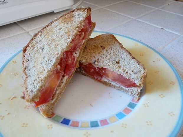 Poner en la 2 rebanada de pan tostado y presione suavemente. Sí, algo del jugo se aplasta hacia fuera - no digo que esto fue un sándwich aseado - sólo muy sabroso! Ahora espere unos minutos más. En este tiempo, el jugo de los tomates, la mayo y la sal están combinando en delicadezas de tomate puro. El interior de las tostadas será picantes y el exterior debe estar crujiente.