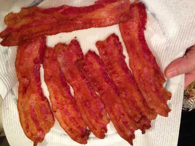 mayoría de los métodos que he visto publicadas en la web para cocinar con microondas tocino tiene problemas.El método de "placa y papel toalla" sólo funciona para un muy pocas piezas ya que saturación las toallas de papel y terminas en efecto fr