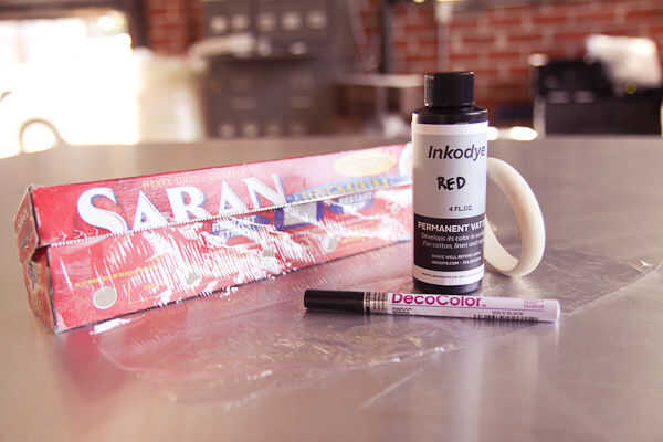 Todo lo que necesitas para este proyecto es un brazalete de madera cruda (conseguimos nuestro de DIYBangles.com), un marcador negro, película de plástico y algunos Inkodye!