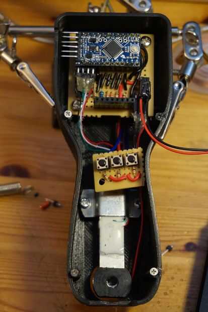 Una vez se reunieron todos los componentes electrónicos, verificamos las conexiones con un polímetro usando una prueba de continuidad simple para asegurarse de que nuestra soldadura emparejado para arriba con el esquema. A continuación ponemos todos juntos en el cuerpo de la manija y que todo encajan. Finalmente, había conectado un cargador USB (ligeramente modificado) a la placa y comprobar que todo marcha.