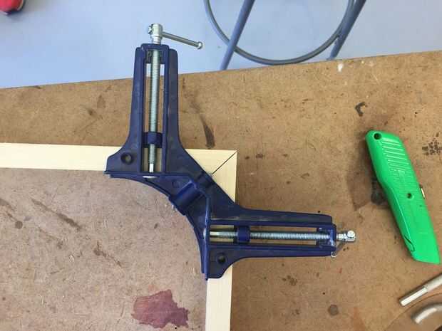 Utilice las abrazaderas de esquina a línea de fondo y piezas laterales en las esquinas al ras (sin proyección entre los bordes). Con el fondo las abrazaderas firmemente en su lugar, afloje las abrazaderas laterales y quitar los lados. Uso de madera pegamento en cola los lados juntos. Utilice cinta para mantener el pegamento en su lugar y lo deje reposar toda la noche. Luego con una pistola de grapas, asegure los bordes. Asegúrese de no pegue o si la ranura de ranura, ya que el acrílico superior y base de madera contraplacada deben encajar en la ranura. Decidimos unir 3 lados y utilizar un accesorio del tornillo para la 4 º parte (pieza superior).
