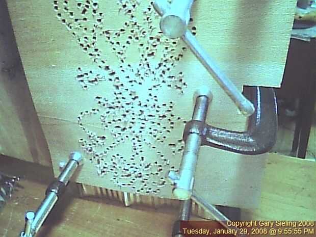 Colocar el metal entre dos piezas de madera y perforar los agujeros con un clavo. Como hacer esto, usted puede encontrar que algunos de la madera se desintegra - mina cayó aparte en la última viñeta, pero todavía que se ahorrará mucho tiempo. Cuando esté todo hecho, rellene los agujeros que faltan con la mano.