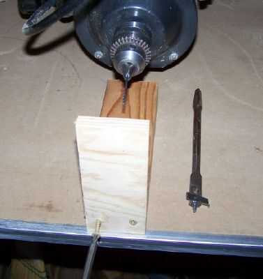 Cortar dos piezas de madera contrachapada de 1/2 pulgada y adjunto el primero de ellos a la pieza de 2 x 3 con tornillos drywall.  Usted puede notar que la broca en el portabrocas es muy pequeña en esta foto.  Este es el tamaño que se utilizaría para hacer un agujero piloto si estuviera usando una llave con un poco de expansión.  El orificio piloto marca el centro de la tirada del taladro y también permite que las roscas de los tornillos sobre la broca de expansión para agarrar la madera y tire de la broca a través para cortar el agujero.