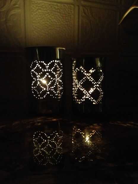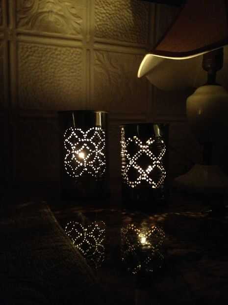 estos son realmente interesante y fácil de hacer! Están hechas de latas de sopa vacía. Todo lo que tienes que hacer es llenar las latas con agua aproximadamente 1/2 pulgada desde la parte superior. Entonces ellos (usted puede poner fuera para ahorrar espacio en el congelador) deben ser totalmente congelados congelar! D (aprendido mi lección!) luego toma un clavo y un martillo el clavo ligeramente. Para obtener los agujeros uniformemente espaciados o un bonito patrón, simplemente use un pedazo de papel con puntos dibujados en él pegadas a la lata. Usted puede obtener patrones lindos fuera Enciclopedia de Martha Stuart de manualidades. El hielo impide que el puede abollar cuando golpee con el martillo. Cuando el hecho golpeando ligeramente el patrón hacia fuera en la lata, fundir el hielo por agua caliente en ella. Diviértete y recuerda que la práctica hace la perfección! D Oh, lo siento! Asegúrese de que poner velas en sus linternas.