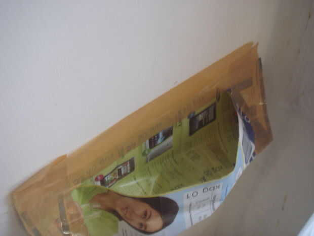 cinta adhesiva en la parte superior, se pegan a la pared justo debajo de su marca de taladro...