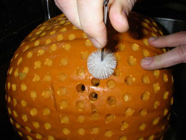 Después de la perforación, raspar el interior de la calabaza con una cuchara u otra "herramienta que raspa de calabaza" para sacar toda la pulpa suelta de la perforación.  Si usted quiere ser muy cuidadoso, utilice un cepillo para limpiar los agujeros de cualquier extra de calabaza de pulpa y luego quitar toda la pulpa de dentro de la calabaza.