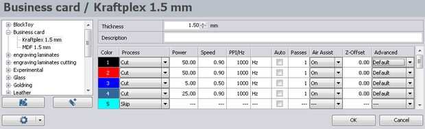 Ajustar la configuración, foco y corte. Buenos resultados para las partes marcadas en el Trotec Speedy 400, utilice una velocidad baja. De lo contrario, la máquina no puede mantener cambiar el laser y el movimiento en sincronización, dando por resultado falta de segmentos de líneas.