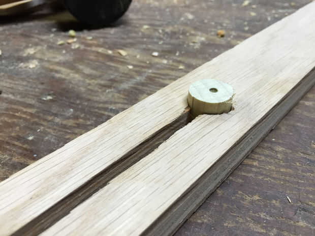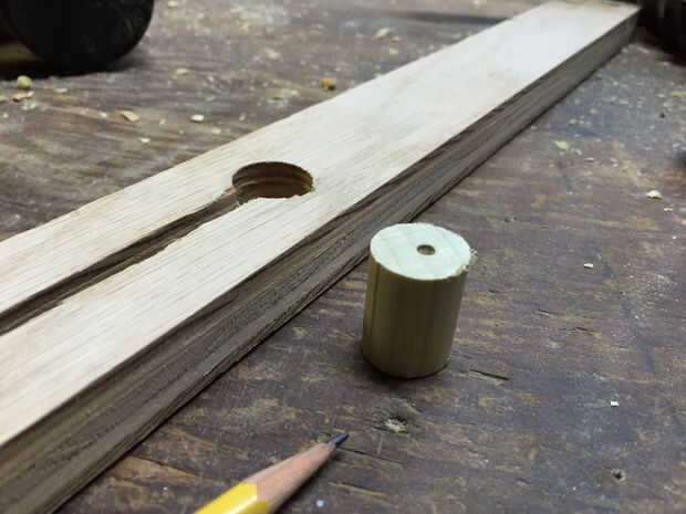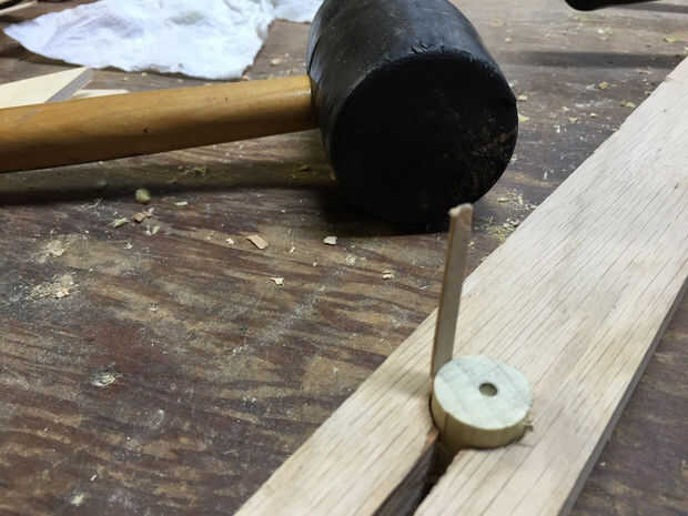Inserte la espiga en la plantilla. Será un poco floja, así que toque en algunas cuñas para endurecer el ajuste.