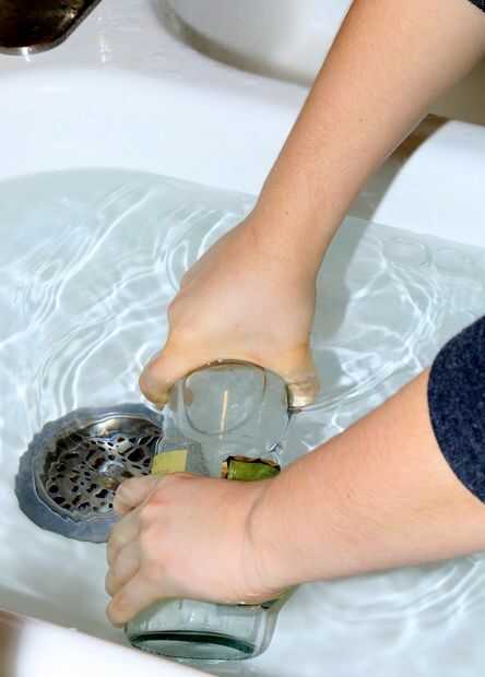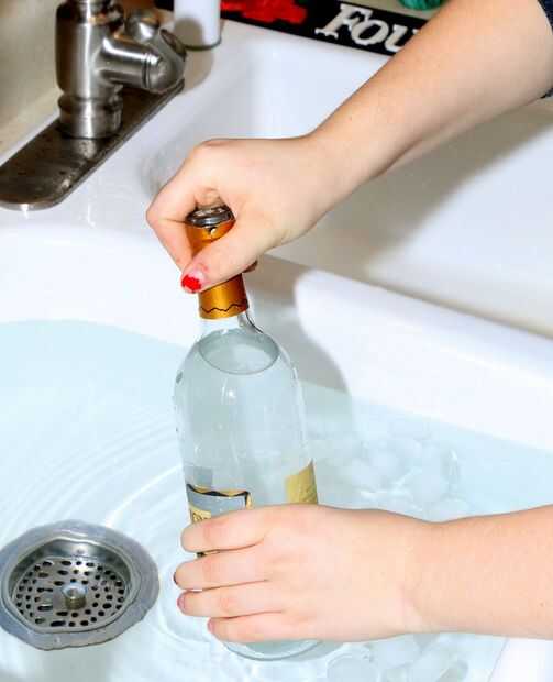 Una vez que se sumerge la botella, debe oír un crack. Se trata de romper la línea. Idealmente, la botella debe ajustar en la mitad donde has hecho la cuenta, pero podría tomar un par de intentos para hacerlo bien. Es totalmente aceptable hacer varios ciclos del proceso frío y caliente. El punto aquí es crear un cambio rápido y extremo de temperatura, que debe causar el cristal romper en el debilitado puntuación línea.