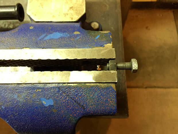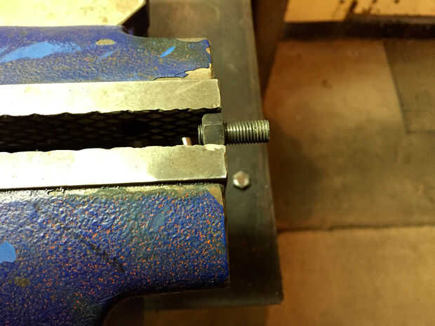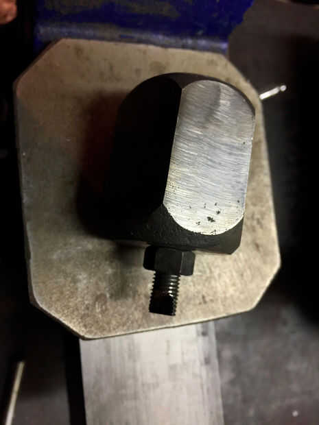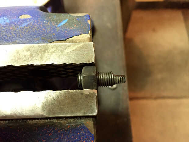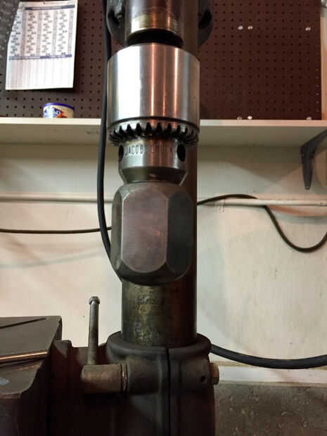 Tomar su fiel imitan para arriba perno de 5/16 NF (que por ahora su probablemente casi gastado hacia fuera) y le cortó la cabeza. Luego moler dos partes planas en la final de la misma para mantener aún con una llave, alicates, alzapríma, etc.. Enrosque el perno en el mando y apretar la tuerca de fijación por lo que parece la cuarta foto. Esto me dio bastante a la Asamblea en el mismo taladro que estaba trabajando en el primer lugar de la tirada.