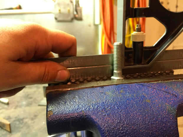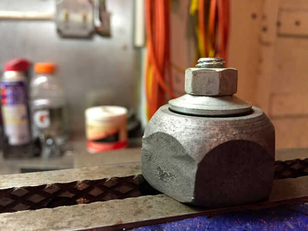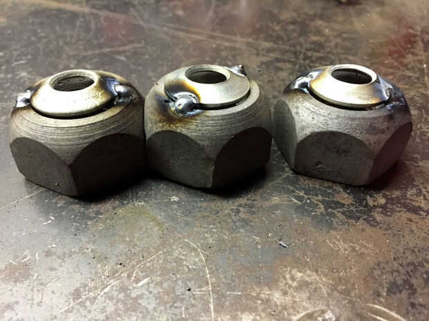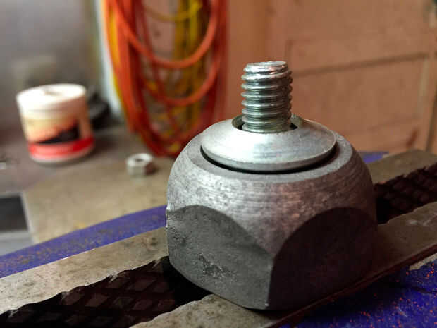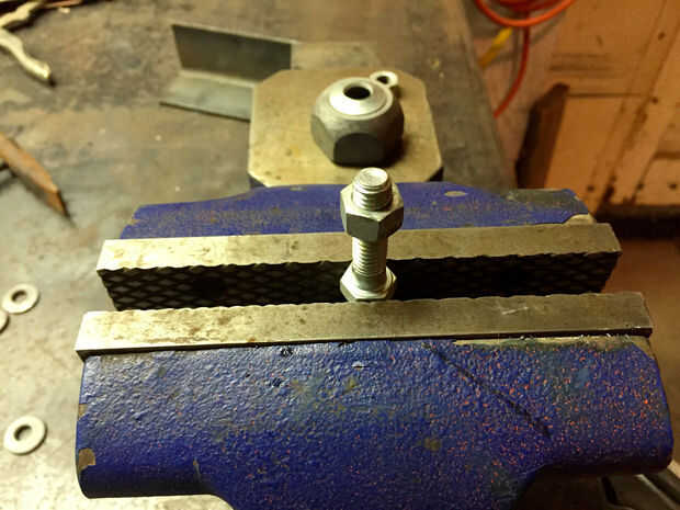 Comience con un perno de 3/8" y Plaza en la prensa. Esta es la forma más sencilla que encontré a todo la plantilla encima. Ejecutar maneras una tuerca en el perno y luego una lugnut sobre el perno en la parte superior de la mordaza. Ahora deslice una arandela sobre la tuerca de 3/8" y usted debe poder ajustar la arandela para que sólo tiene un pequeño espacio por encima de la lugnut. Esta diferencia es importante porque permitirá la soldadura (una vez tierra de) para hacer la transición perfecta entre el cono en el lugnut y el plato en la lavadora.