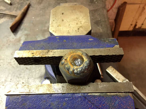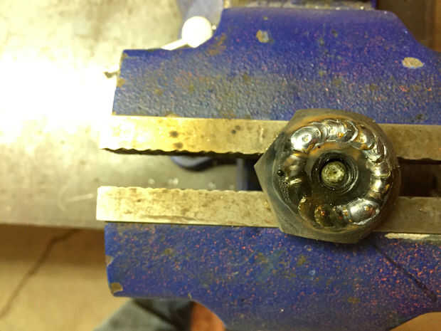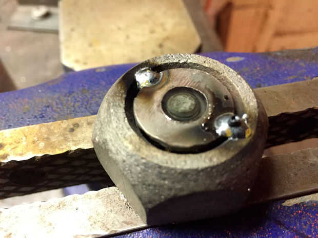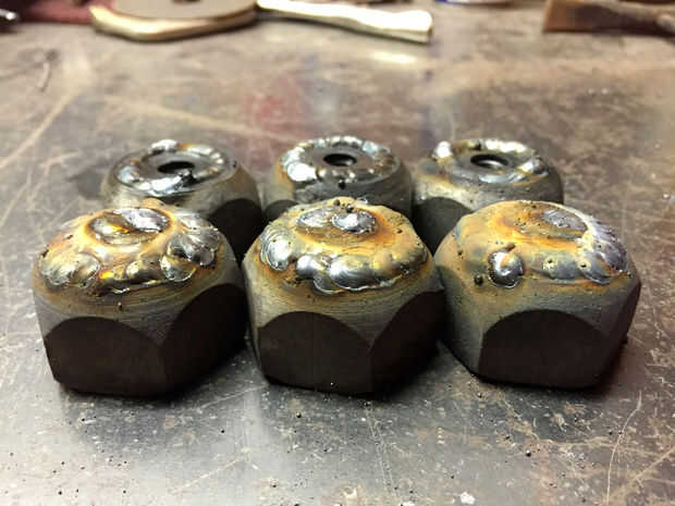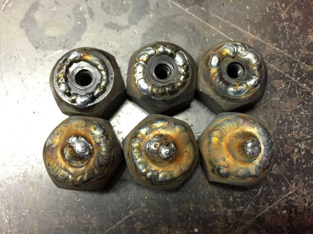 En la arandela cóncava lugnuts necesita soldar el agujero así. Esto podría tomar un poco de práctica y paciencia si eres un principiante. No te preocupes si las soldaduras no se ven perfectas. Buena penetración y relleno de material es lo que buscas.