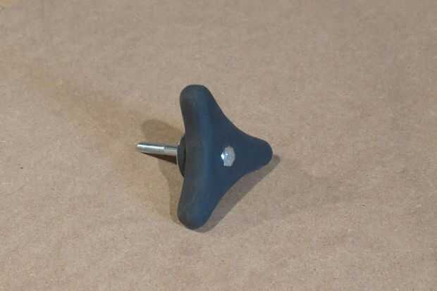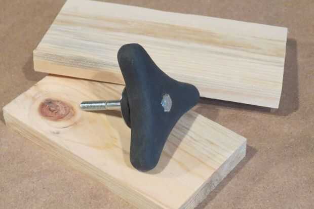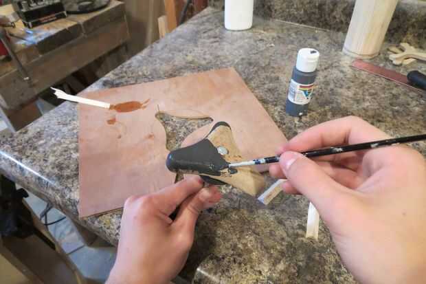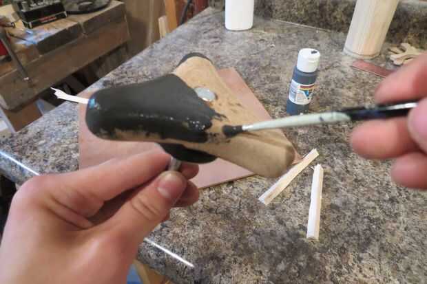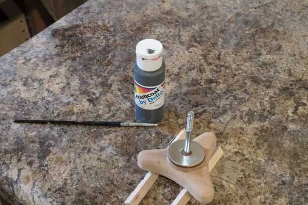 El paso final fue pintar las superficies de madera de la perilla. Decidió dejar el metal perno y la arandela que sus superficies expuestas y acabo de ir con cuidado a su alrededor. Es un truco que utilizo para dejar secar las piezas para que circule en las tiras de corte triangular offs, así que no hay mucha superficie para frotar sobre.