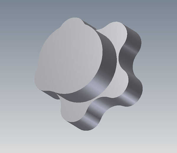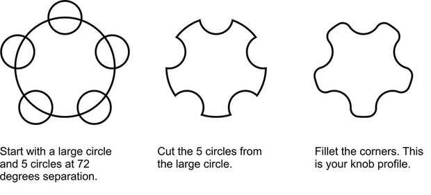 Nota que la mayoría perillas ahi son 4 dientes. Tal vez hay una razón de facilidad de uso para esto, pero me sentía como con 5 puntas. Por lo tanto, en lugar de espacio todo separadas 90 grados, usé 72 grados. Esto plantear un problema al centrar el objeto como el centro de un pentagon al que encerrar en un rectángulo, no es lo mismo que el centro del Pentágono mismo cuando encapsulan en un círculo. Es posible me faltaba algunos ajuste en la herramienta de mi CAM, pero al final he resuelto el problema de modelar el elemento dentro de un círculo más grande (como puede verse en la última foto)
