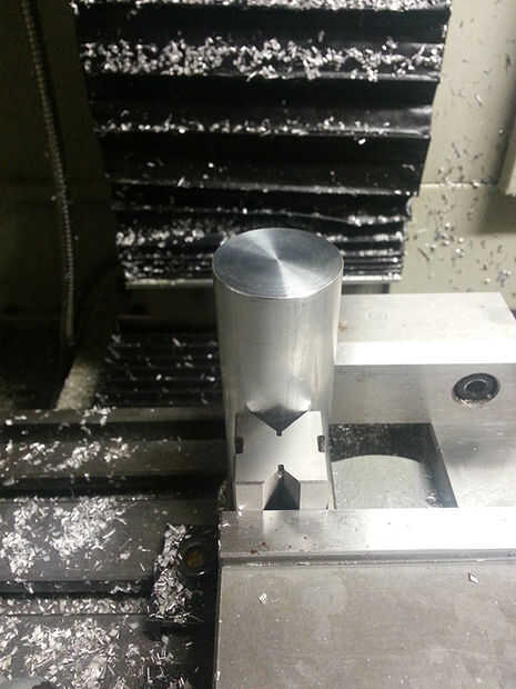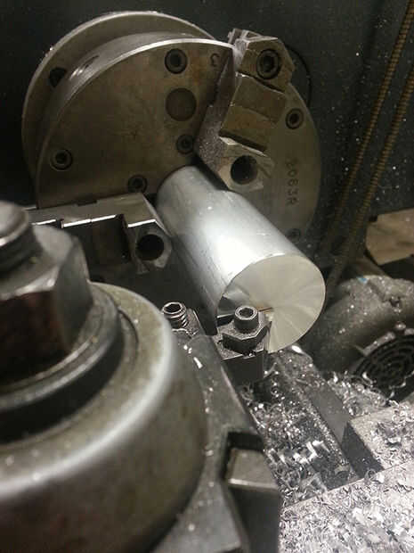 Cortar un trozo de su material favorito. Para esta parte corté algunas barra de aluminio 6061 T6 con un diámetro de 1 5/8". La longitud real de la acción no necesita ser demasiado preciso. No corte demasiado corto, o será demasiado material de desecho. No cortar demasiado o causará vibraciones no deseadas o peor aún, no puede caber en su envoltura de eje de Z de la máquina. Sólo de ojos balled cerca de 8 pulgadas o menos.