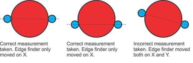 En mi pequeño diagrama aquí, muestro cómo idealmente ya estaríamos en el centro Y cuando tomamos las medidas de dos de borde X (figura derecha). Nadie podría imaginar que se trata de la única manera de encontrar el verdadero centro de la pieza en el eje X. Suponiendo que la parte es perfectamente redonda, sin embargo, podemos realmente hacer esta medición cada vez que queremos (como se muestra en la figura del centro) y todavía encontraría el centro en X.
