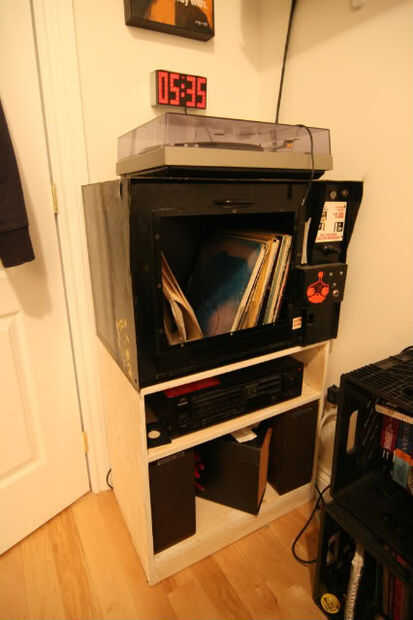 Tengo unos altavoces de Koss genial que también encontré en la basura para encajar perfectamente en el último estante. Siempre que recibo bastantes registros, la plataforma es lo suficientemente alta como para que puedan caber muy bien en. Pronto podría manchar la ply o pintarlo de algún color.