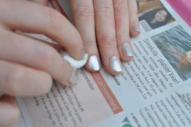• Luego use un hisopo de algodón o una punta de referencia sumergido en removedor de esmalte de uñas para frotar el esmalte sobrante fuera de las uñas.
