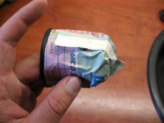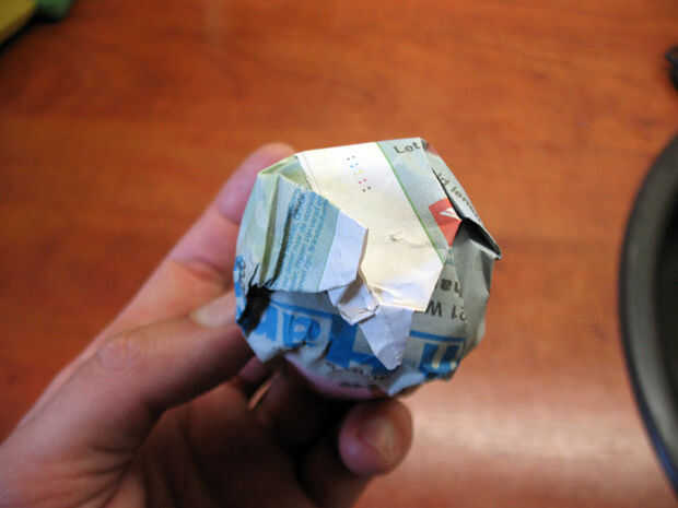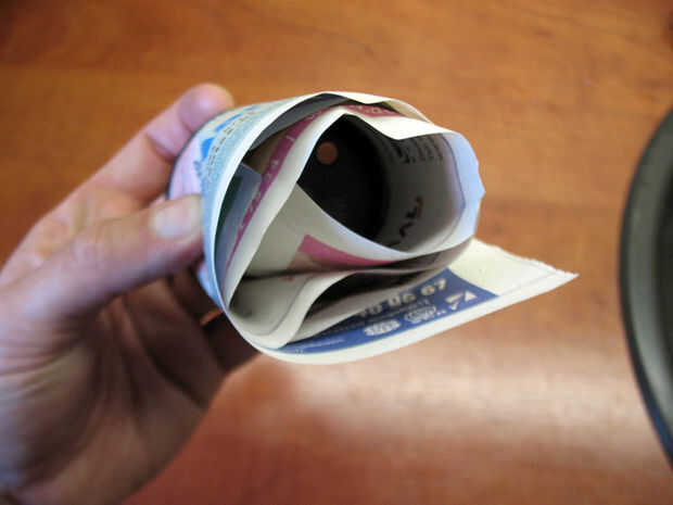 Envolver un pedazo de papel alrededor de la olla plástica. El papel debe ser más ancho que la olla, por lo que se puede doblar alrededor de la parte inferior. Lo mejor es envolver tan estrecha como sea posible. Pero no te desesperes si está un poco flojo. El agua en el siguiente paso será pegarlo todo junto.