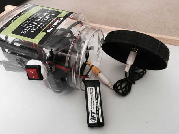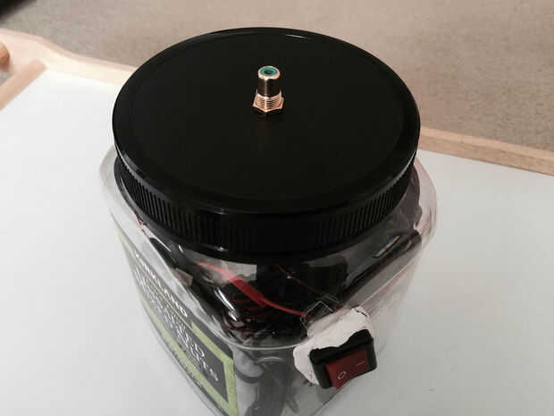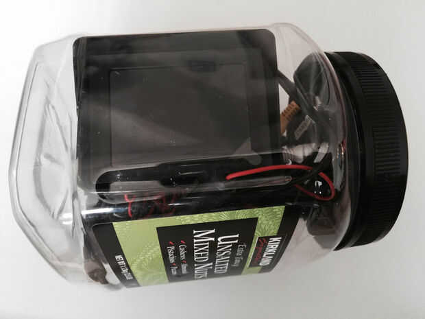 Este monitor de la vivienda mantendrá el agua cuando llueve o mar aerosol, pero no es impermeable. Más de una forma de controlar todos los hilos relacionados con este proyecto. También tengo una mochila de hombro pequeña para llevar los 100 pies de cable de video. El contenedor es una jarra de plástico reciclada mezcla de frutos secos con una tapa de rosca redonda de Costco.