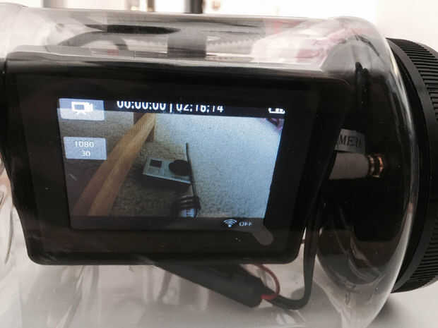 El monitor es un pequeño 3.5" LCD pantalla de la cámara de copia de seguridad disponible en línea. He añadido un interruptor entre el monitor y un 3s LiPo batería utilizada para coches RC. Su recargable y hasta ahora dura más de 1.5 hrs, duración de la batería adicional todavía se necesitan exámenes. Soldado los cables al interruptor antes de montar el interruptor, por lo tanto la colocación impar y sugru para asegurar el interruptor. Asegúrese de planificar donde irá el interruptor antes de que la soldadura de los cables.
