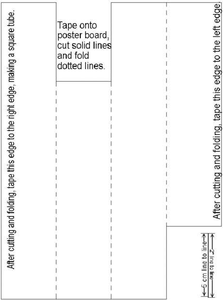 Rough cut (corte de burbuja) alrededor de las líneas sólidas y pegue 4 "donas" de cinta en las esquinas de la parte no impresa. El patrón sobre la cartulina y cortar por las líneas sólidas en el exterior de la cinta. Mantener el patrón de pegar con cinta adhesiva hasta que haya cortado y doblado en las líneas.