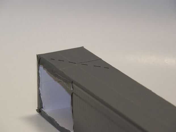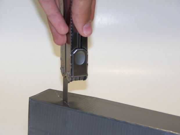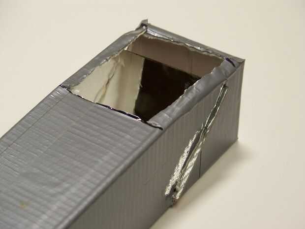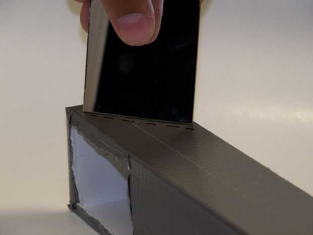 Te aconsejo la línea de dibujo primero en ambos lados de la caja lo más cerca entre sí como sea posible. Luego deslice eres cuchillo en la caja y cortar las ranuras. Cuando hayas terminado, deslice el espejo a través de uno y otro, de modo que el lado reflectante del espejo enfrenta a la apertura del agujero.