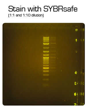SYBRsafe utilizando manchas, usted podrá ver a sus bandas. Por debajo es una imagen de muestra, con la caja de perlas de gel.